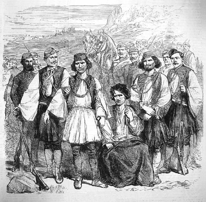 τη συμμορία τους. Εποχή ληστοκρατίας, το ελληνικό κράτος έχει λίγους χρόνους ανεξάρτητης πολιτικής οντότητας, ο βασιλιάς Γεώργιος είναι μόνο επτά χρόνια στον θρόνο. Δέκα περιηγητές και ξεναγοί, Άγγλοι και Ιταλοί υπήκοοι, συνοδεία χωροφυλάκων, επισκέπτονται τον Μαραθώνα. Κατά την επιστροφή, μεταξύ Σπάτων και Πικερμίου, απάγονται από τον Τάκο και τον Χρήστο Αρβανιτάκη και τους ένοπλους συμμορίτες τους. Οι ληστές κράτησαν κάποιους από αυτούς ως ομήρους και απαίτησαν υπέρογκα ποσά και αμνηστεία ώστε να τους αφήσουν ελεύθερους. Οι διαπραγματεύσεις δεν κατέληξαν πουθενά, ο Στρατός κυνηγούσε τους ληστές και τελικά οι αιχμάλωτοι σφαγιάστηκαν. Αμέσως, ξέσπασε διπλωματικό επεισόδιο: η Ελλάδα αποζημίωσε τους συγγενείς των θυμάτων και η κυβέρνηση Θρασύβουλου Ζαΐμη παραιτήθηκε. Η Ευρώπη τάχτηκε κατά της Ελλάδας με απίστευτο ανθελληνικό μένος, επεμβάσεις Αγγλίας και Ιταλίας στα εσωτερικά της χώρας (ακόμη και παρουσία επιτετραμμένων στις συνεδριάσεις της Βουλής) και πολλά άλλα. Αν δεν ξεσπούσε ο Γαλλοπρωσικός πόλεμος για να αποσπάσει την προσοχή της διπλωματικής κονίστρας, τα πράγματα θα οξύνονταν σε ασύλληπτο βαθμό.